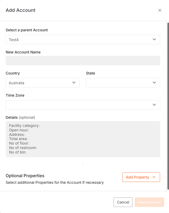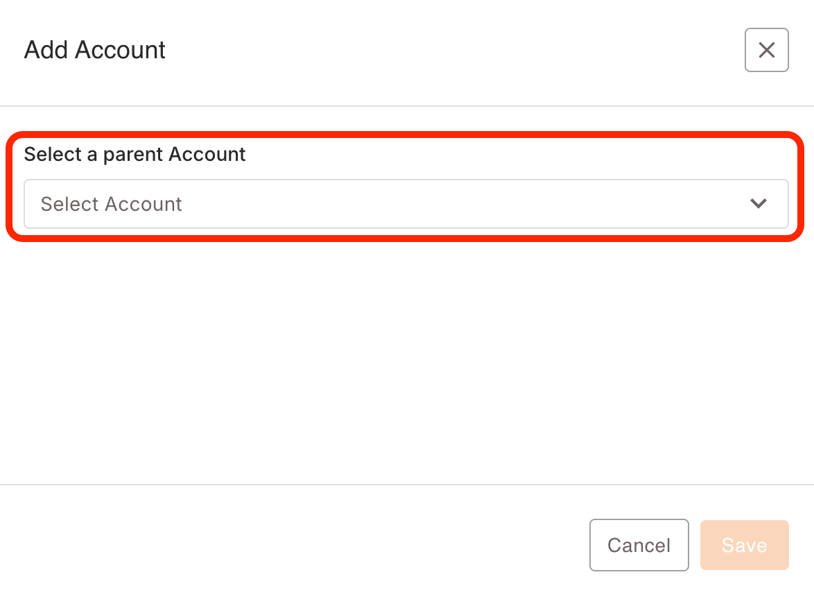 - [Add Account]モーダルウィンドウで新しいアカウントを作成する親アカウントを選択します。