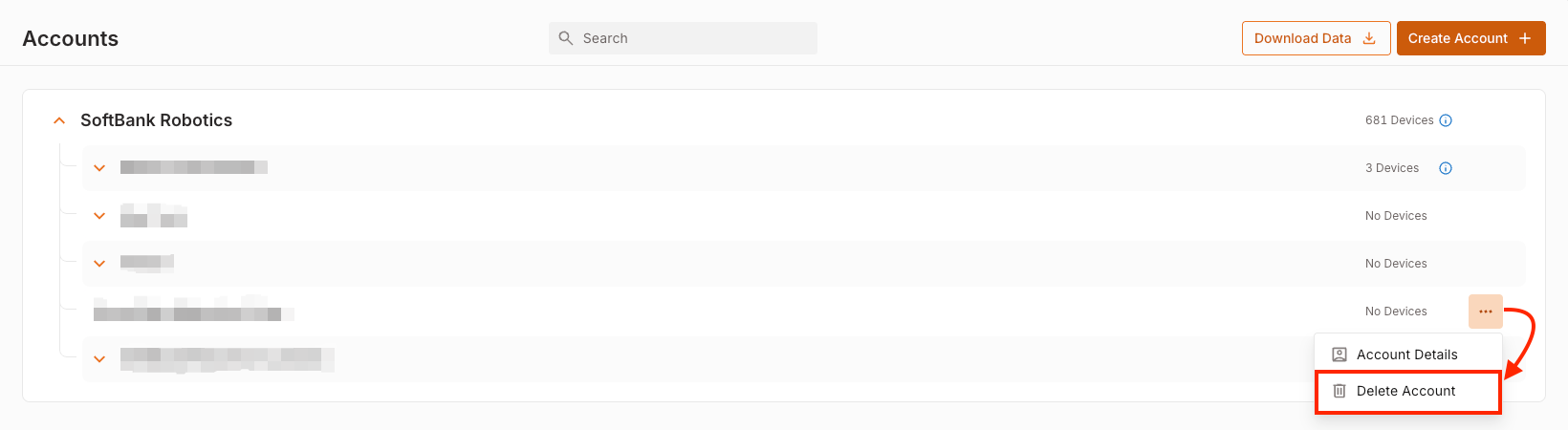 子アカウントを持つアカウントは削除できません。外部システムUUIDを持たない最下位アカウントのみ削除可能です。([Delete Account]がプルダウンリストに表示されません)。