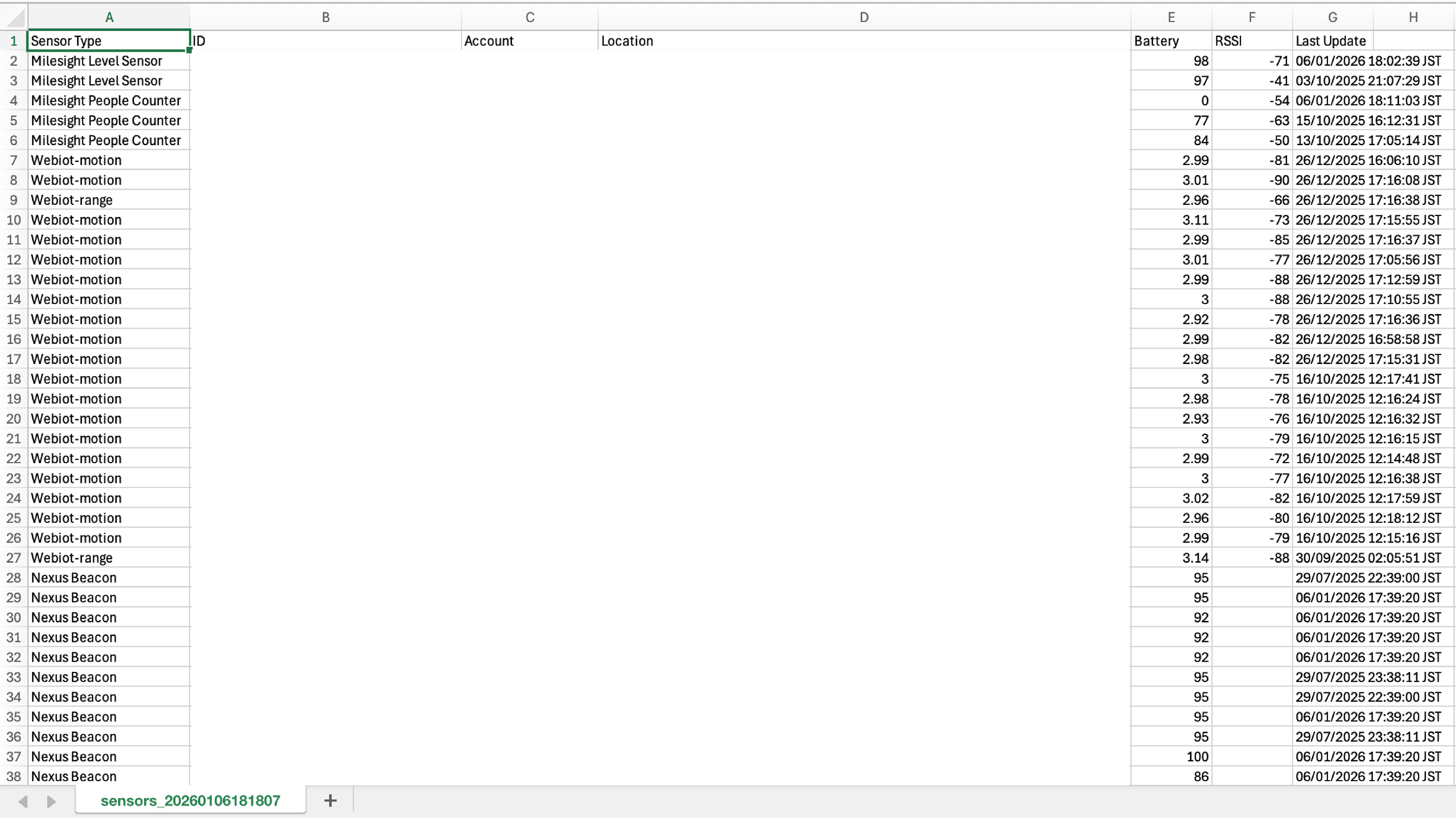 ダウンロードするExcelファイルの見本です。センサータイプ、センサーID、アカウント、場所、バッテリー状態、RSSI、最終更新日を確認できます。
