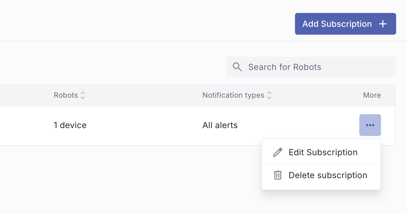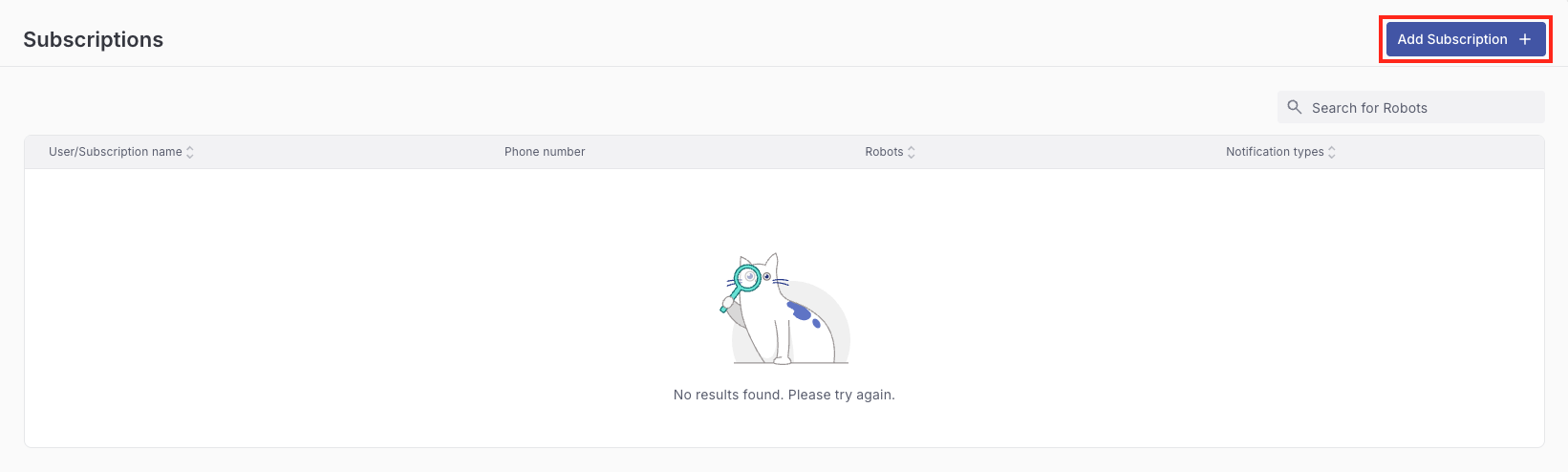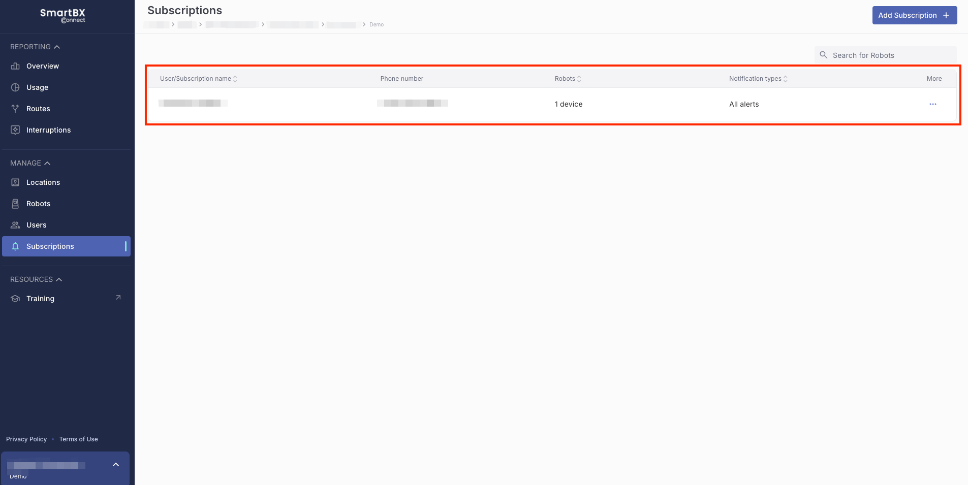 サブスクリプション機能を使用すると、清掃開始、清掃完了、アラートなど、ロボットデバイスからのモバイル通知を受け取ることができます。電話番号を追加して既存のサブスクリプションを確認でき、いつでも内容を更新できます。SBX Connectでサブスクリプションを登録した後、電話番号に送信されるメッセージの指示に従ってオプトインします。