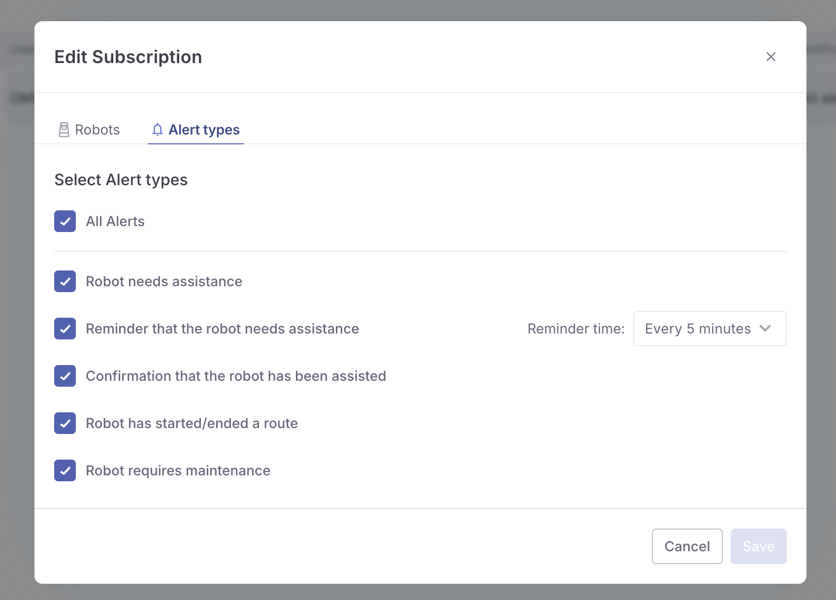 - 必要に応じてウィンドウの情報を編集し、[Save]を選択します。ウィンドウ上部のタブを使用して、サブスクリプションとアラートタイプに関連するロボットの編集を切り替えます。