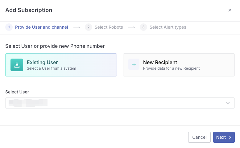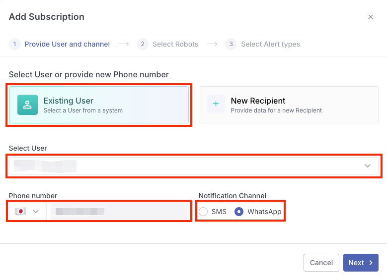 Existing User(既存ユーザー)」とUser名を選択し、Phone numberを入力してNotification Channel(SMSまたはWhatsApp)」を選択します。Nextをクリックします。