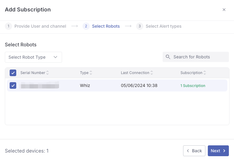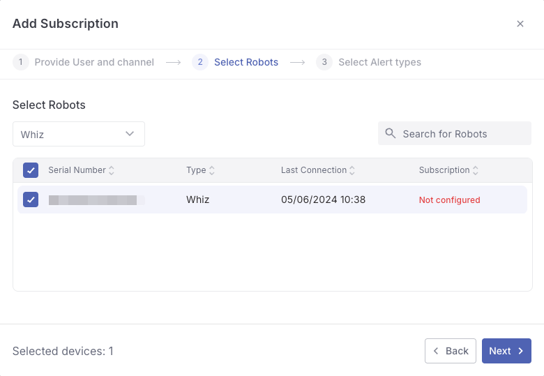 サブスクリプションに含めるデバイス(ロボット)を選択します。Nextをクリックします。