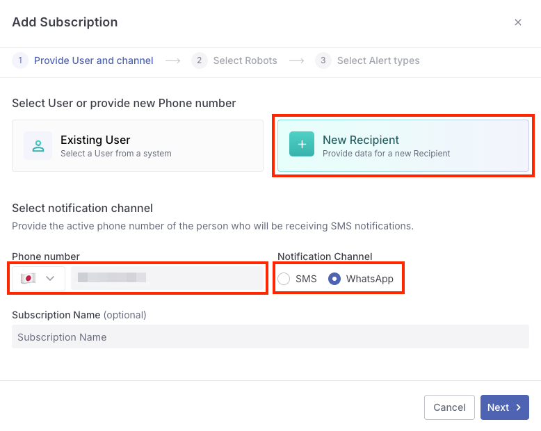 New Recipientを選択し、電話番号を入力してNotification Channel(SMSまたはWhatsApp)を選択します。Nextをクリックします。
