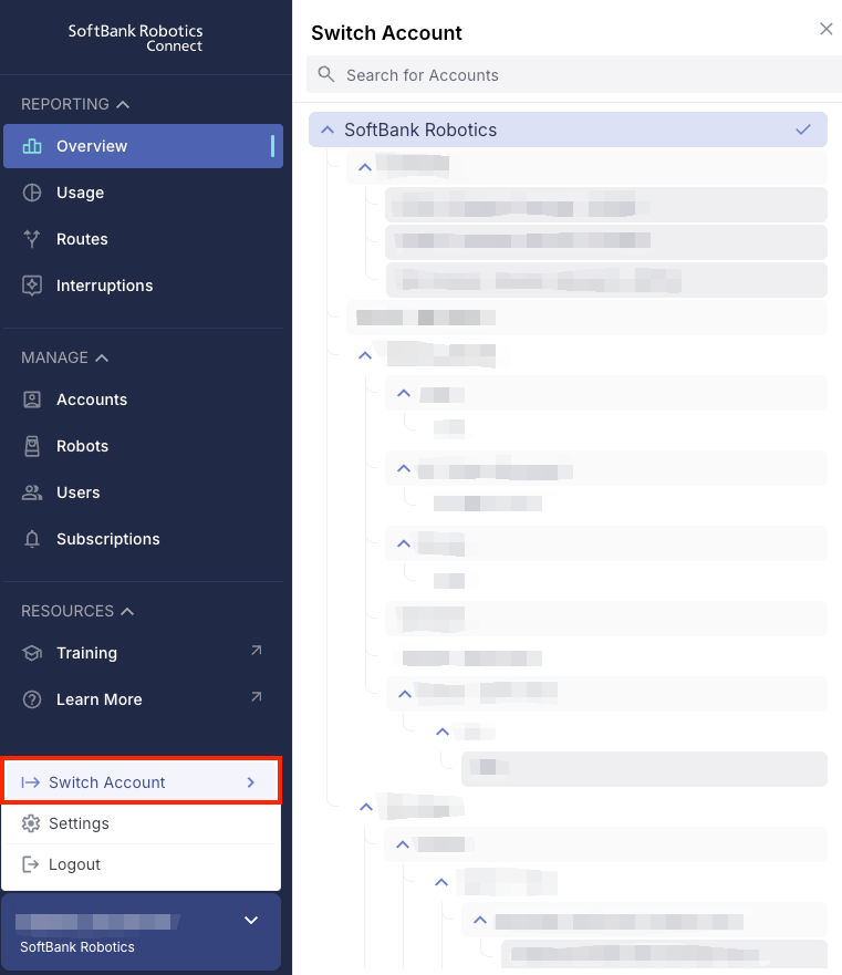 - 既存のサブスクリプションを削除するには、Switch Accountをクリックします。次に、アクティブなロボットが紐づいている最下位のアカウントを選択します。