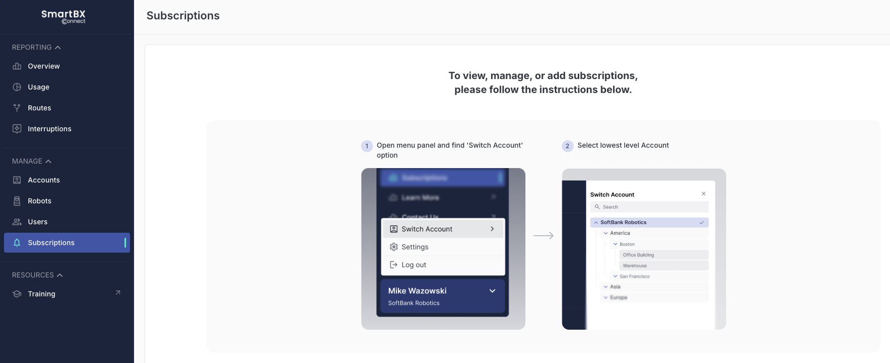 - 既存のサブスクリプションを編集するには、Switch Accountをクリックします。次にアクティブなロボットが紐づいている最下位のアカウントをを選択します。