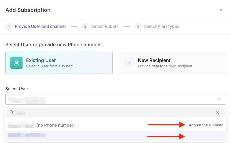 新規の受信者:ユーザーを登録せずに電話番号を追加してサブスクリプションを設定します。