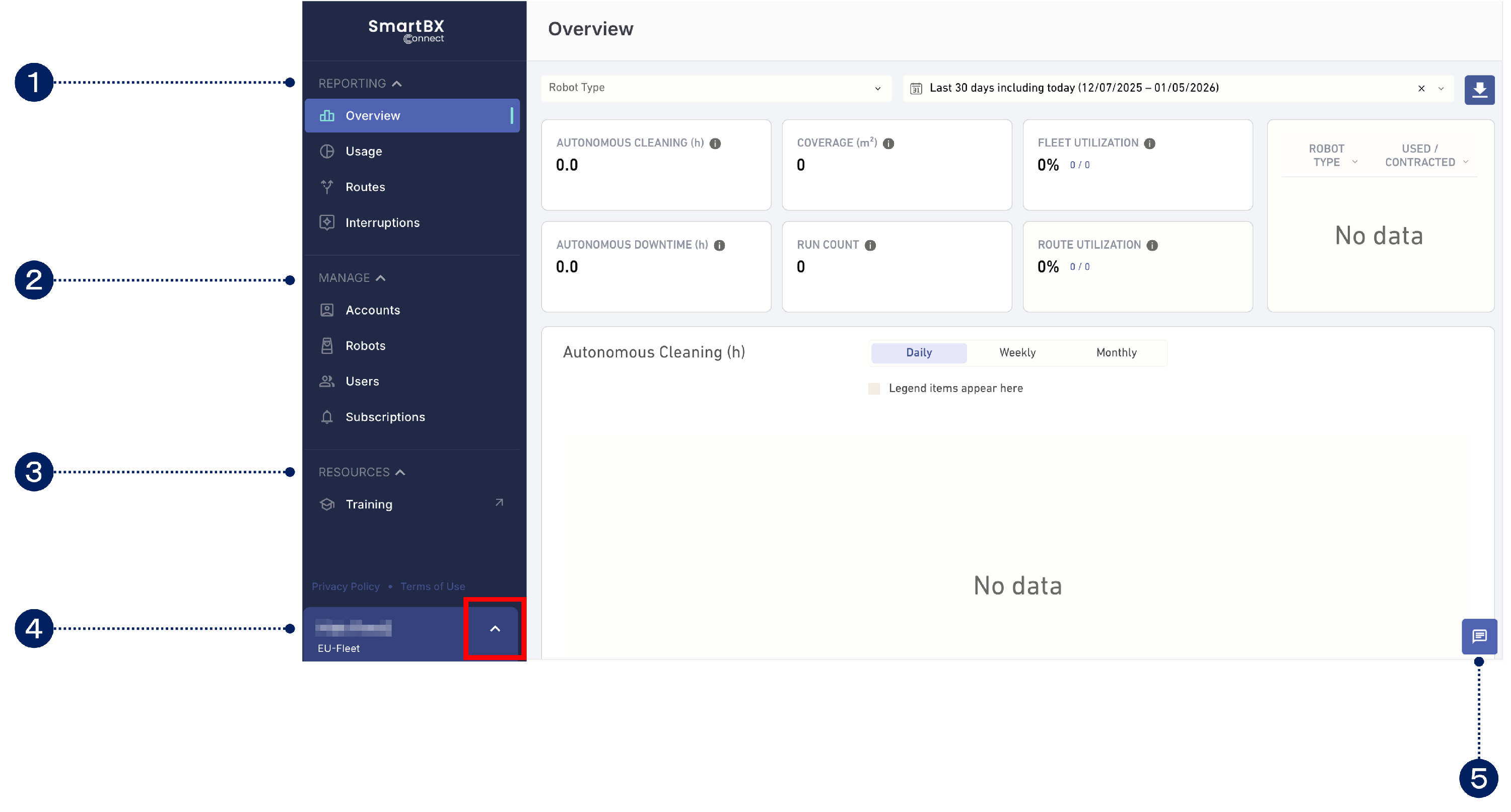サインイン後、SBX Connectのインターフェイスから、レポート、管理ツール(アカウント、ロボット、センサー、ユーザー)、ヘルプセンターへのリンク、および個人設定にアクセスできます。表示されるセクションとアクションは、ユーザー権限や通知設定によって異なります。