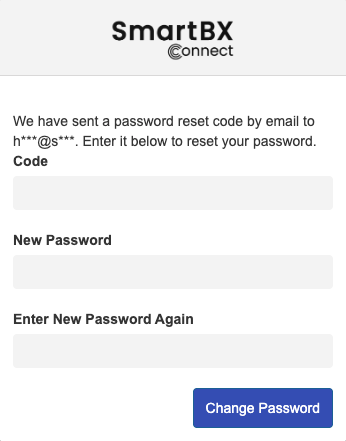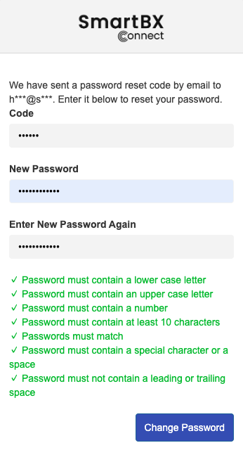 - Code欄にリセットコードを入力し、新しいパスワードを入力します。Change Passwordをクリックします。